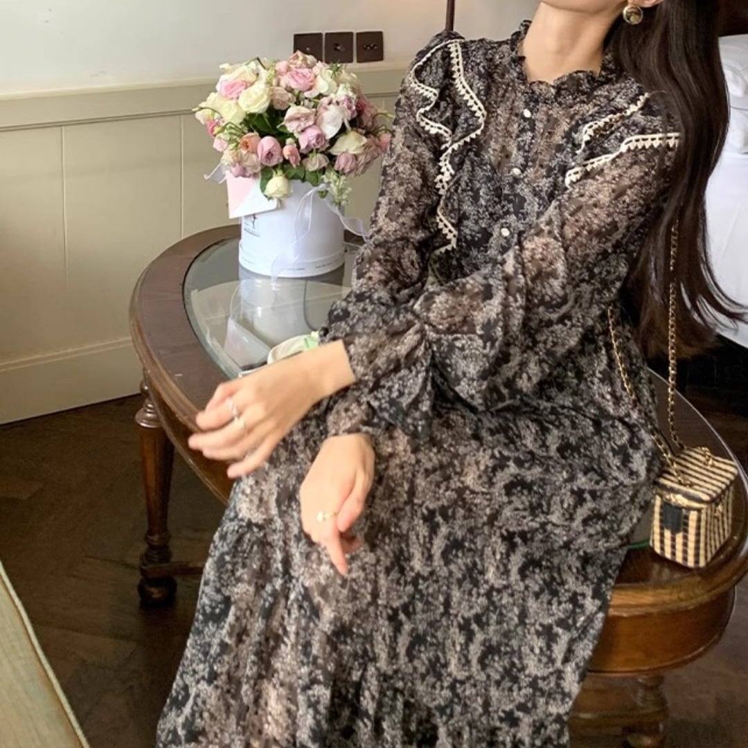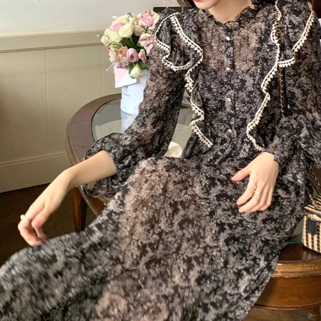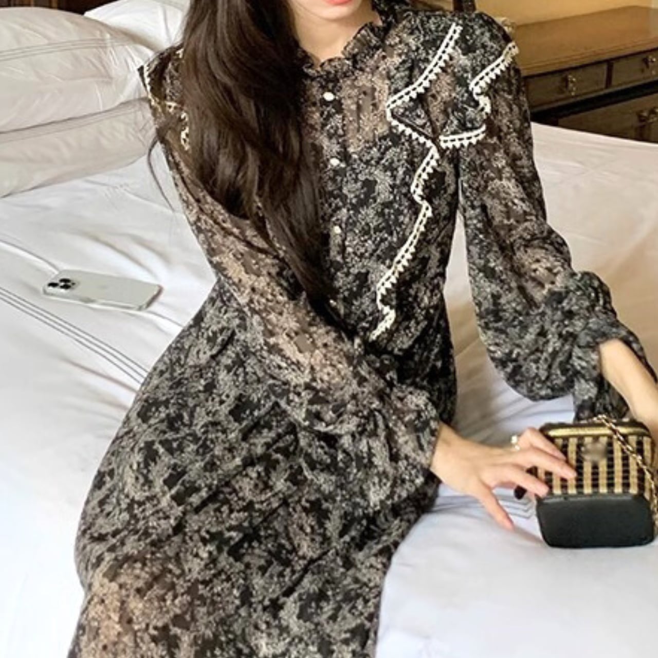 上品なシアー感と、可愛らしい胸元のフリルデザインが絶妙なバランスのロングワンピース。シンプルなデザインながら、洗練された雰囲気を演出します。オフィスシーンにも、休日のお出かけにも使える汎用性の高さが魅力です。様々なコーディネートに合わせやすく、ワードローブにぜひ加えたいアイテムです。