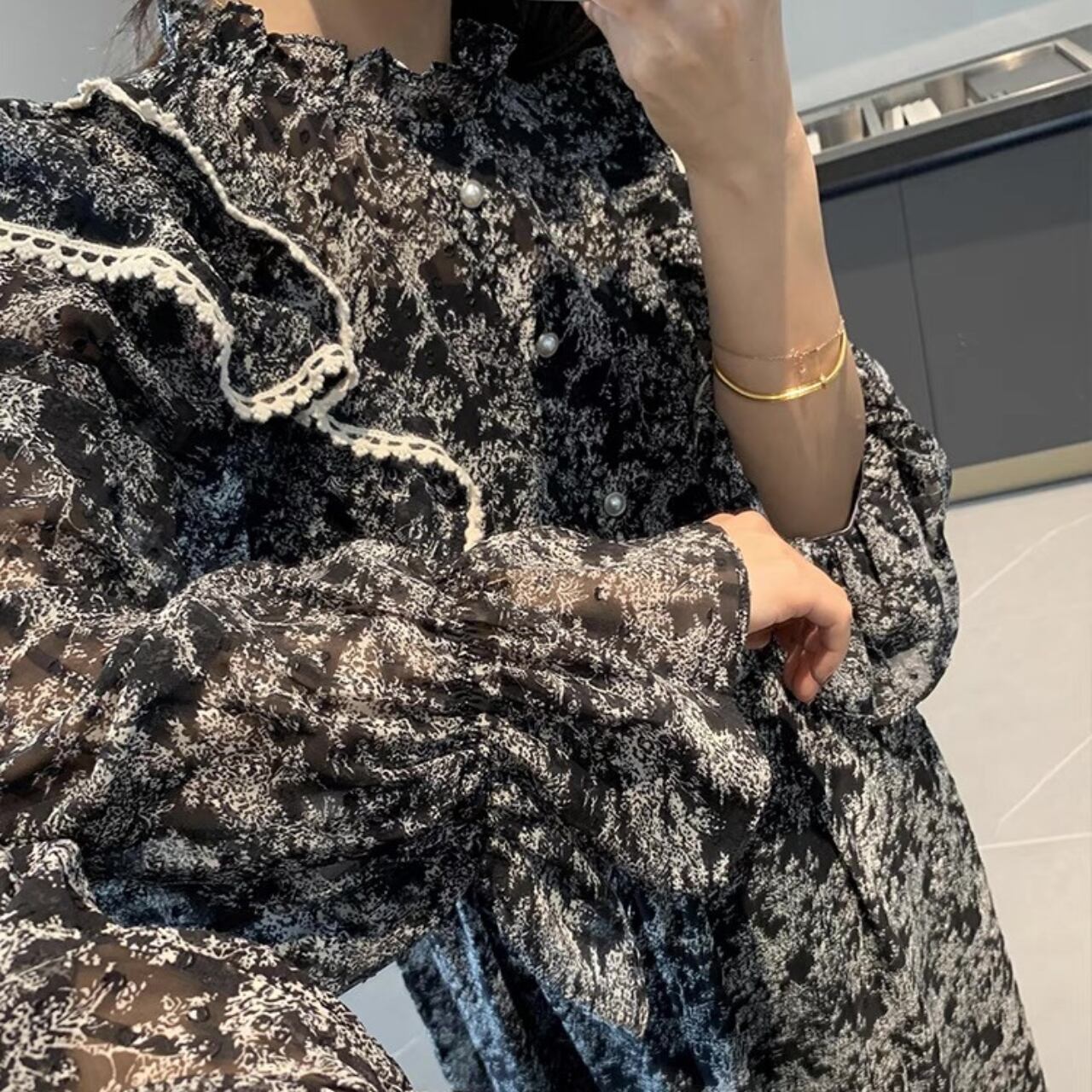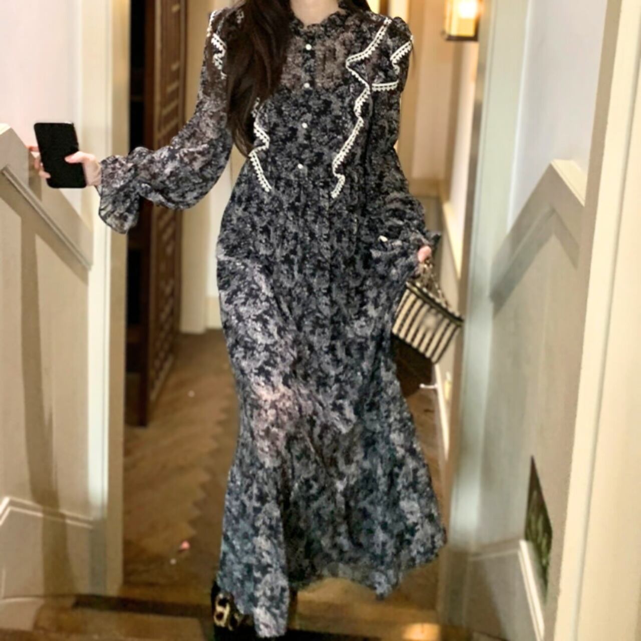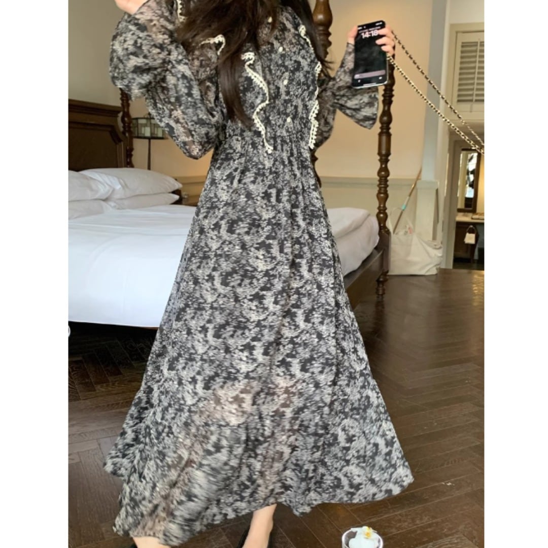 上品なシアー感と、可愛らしい胸元のフリルデザインが絶妙なバランスのロングワンピース。シンプルなデザインながら、洗練された雰囲気を演出します。オフィスシーンにも、休日のお出かけにも使える汎用性の高さが魅力です。様々なコーディネートに合わせやすく、ワードローブにぜひ加えたいアイテムです。