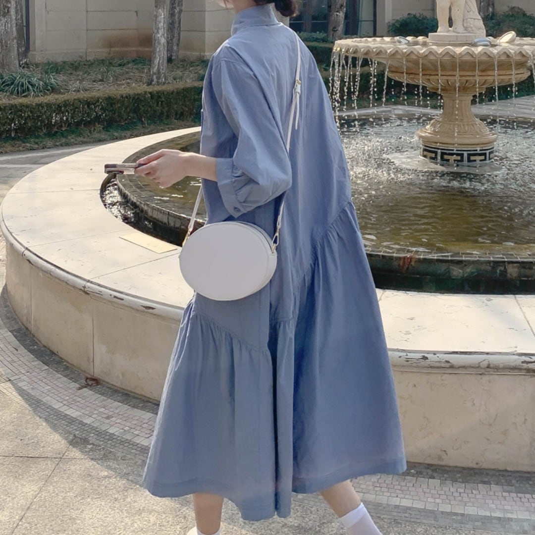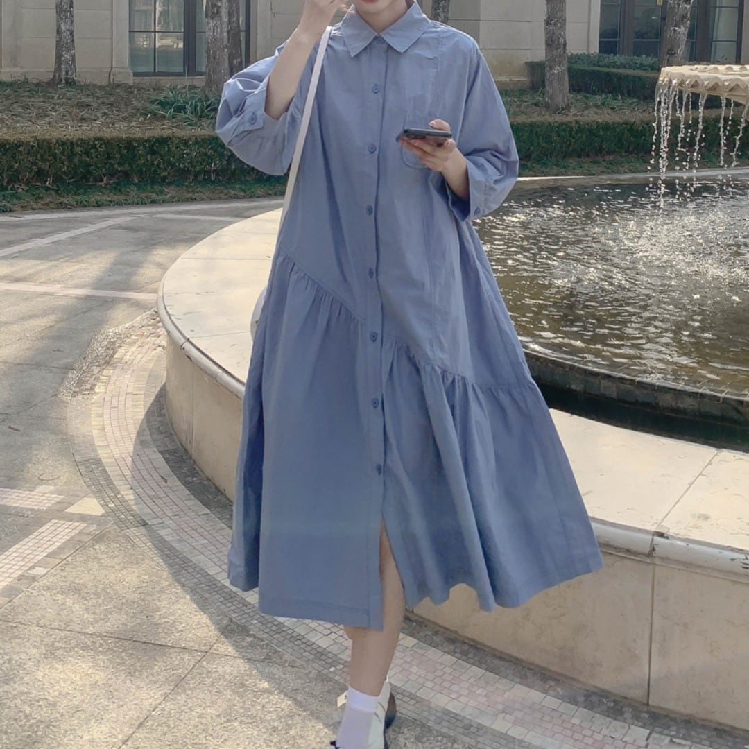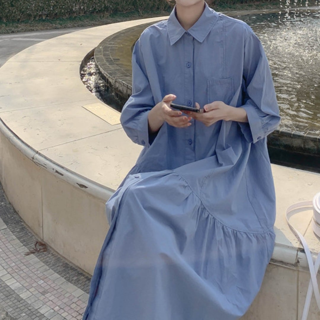 繊細な刺繍とフリル襟が特徴的な、七分袖のロングワンピース。