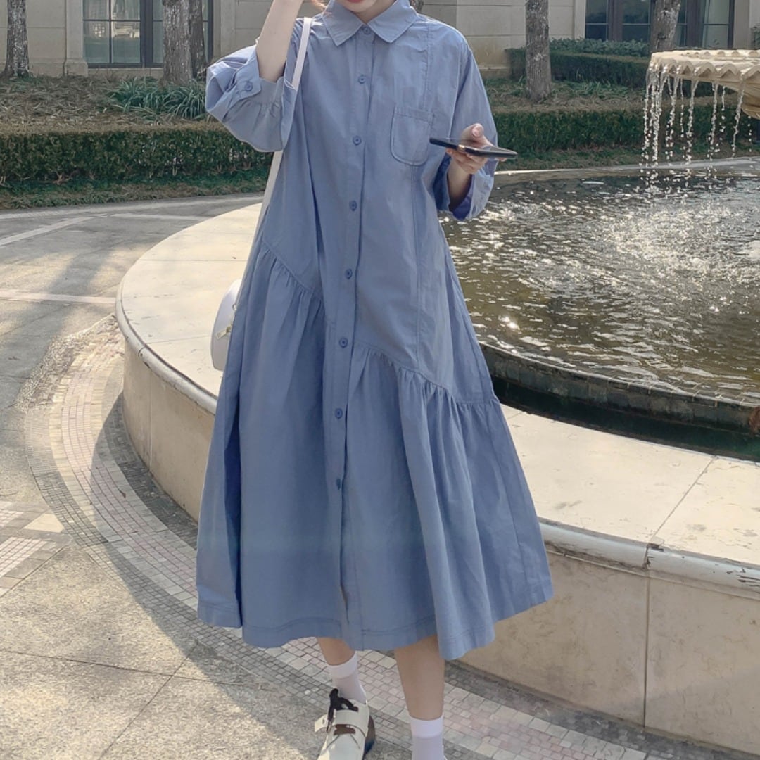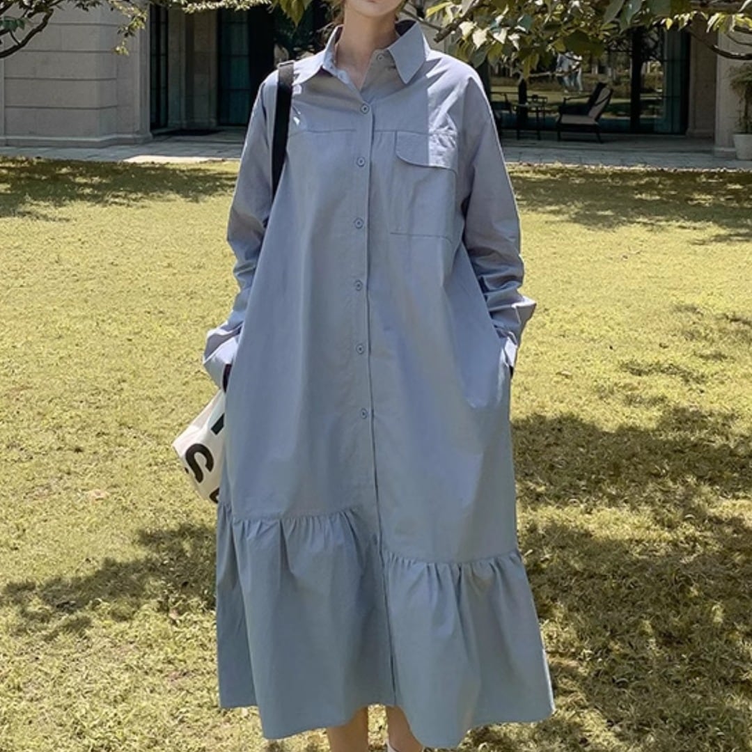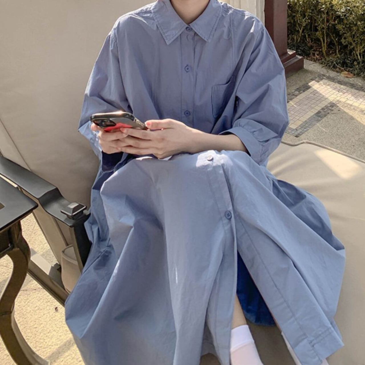 繊細な刺繍とフリル襟が特徴的な、七分袖のロングワンピース。