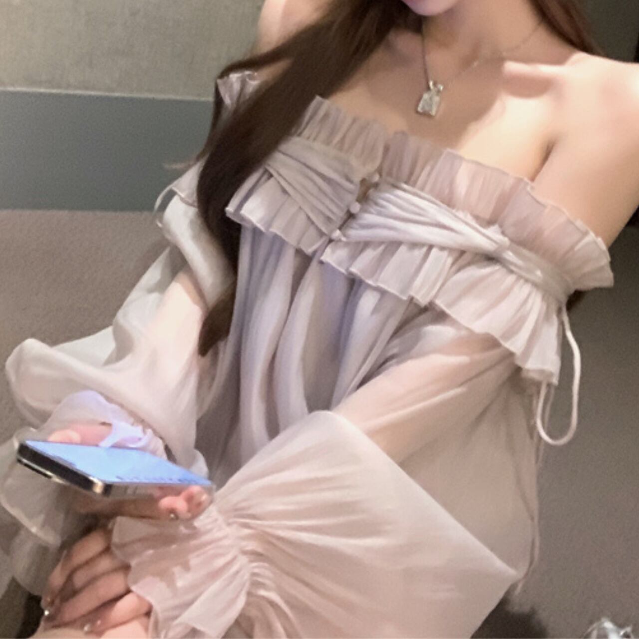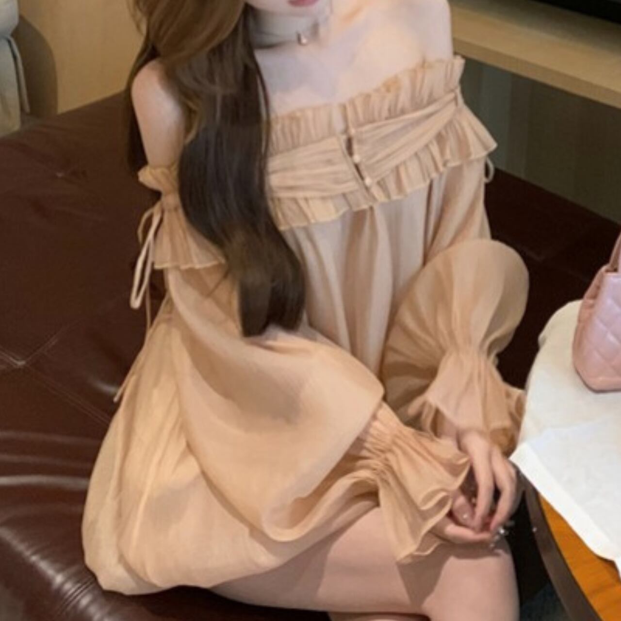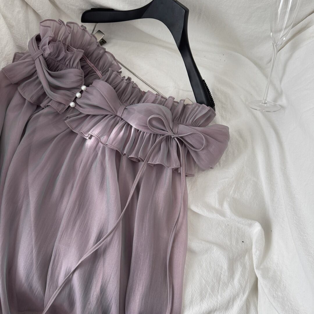 オフショルダーのデザインとバルーンスリーブが、女性らしいフェミニンな印象を演出するブラウス。繊細なフリルが胸元を華やかに飾り、さりげない上品さをプラスします。ロングスカートと合わせて優雅なスタイルに、デニムと合わせてカジュアルダウンした着こなしも楽しめます。様々なシーンで活躍する、着回し力の高いアイテムです。一枚持っていると便利な、ヘビロテ間違いなしの一枚です。