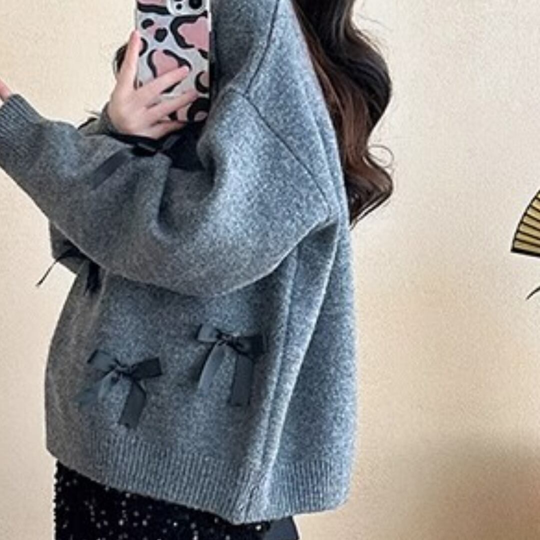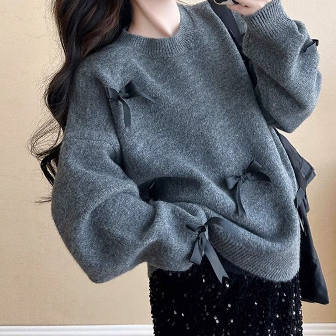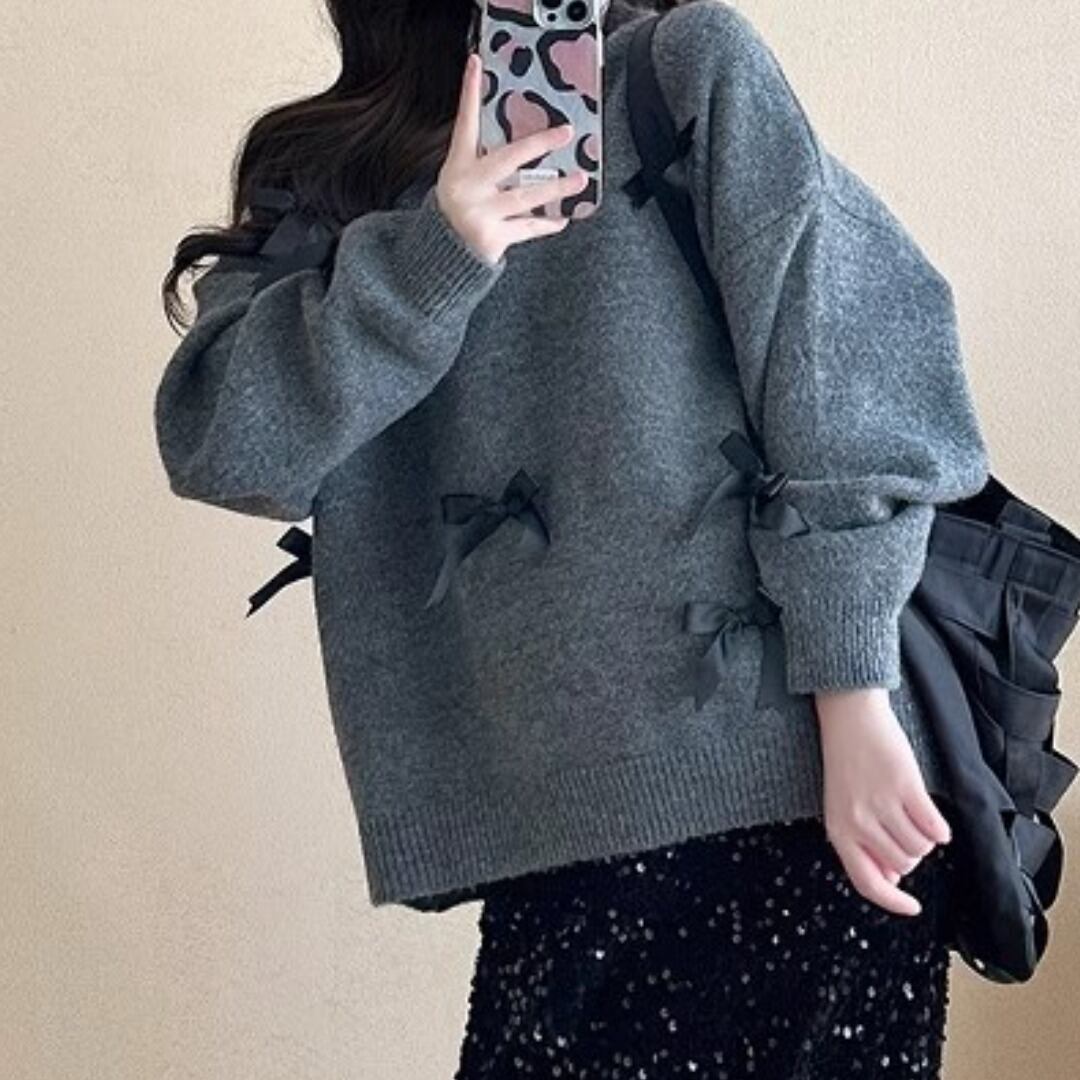 オーバーサイズのクルーネックプルオーバーは、さりげなく散りばめられたブラックのリボンがポイント。シンプルながらも可愛らしさをプラスし、着こなしに華やかさを添えます。ゆったりとしたシルエットで、リラックス感あふれる着心地です。様々なボトムスと合わせやすく、デイリーユースに最適なアイテムです。一枚あると重宝すること間違いなしの一着です。