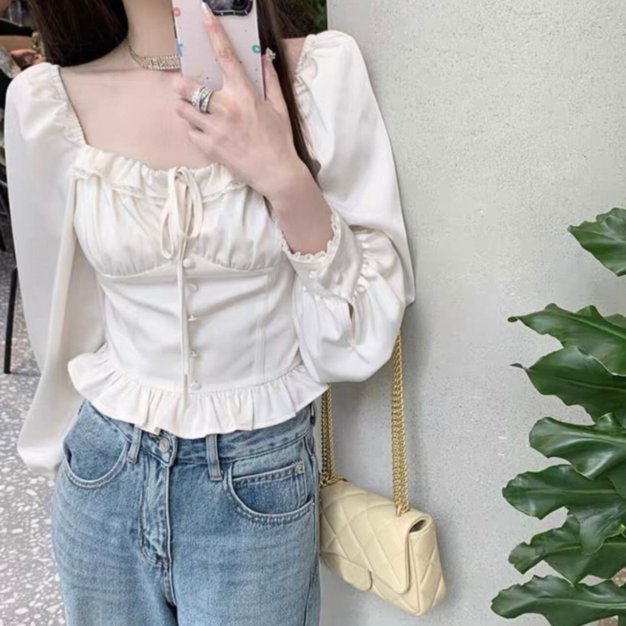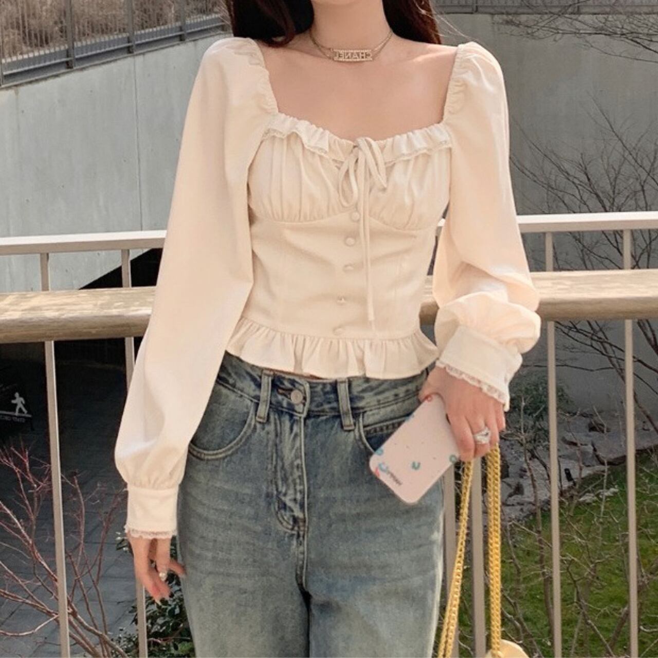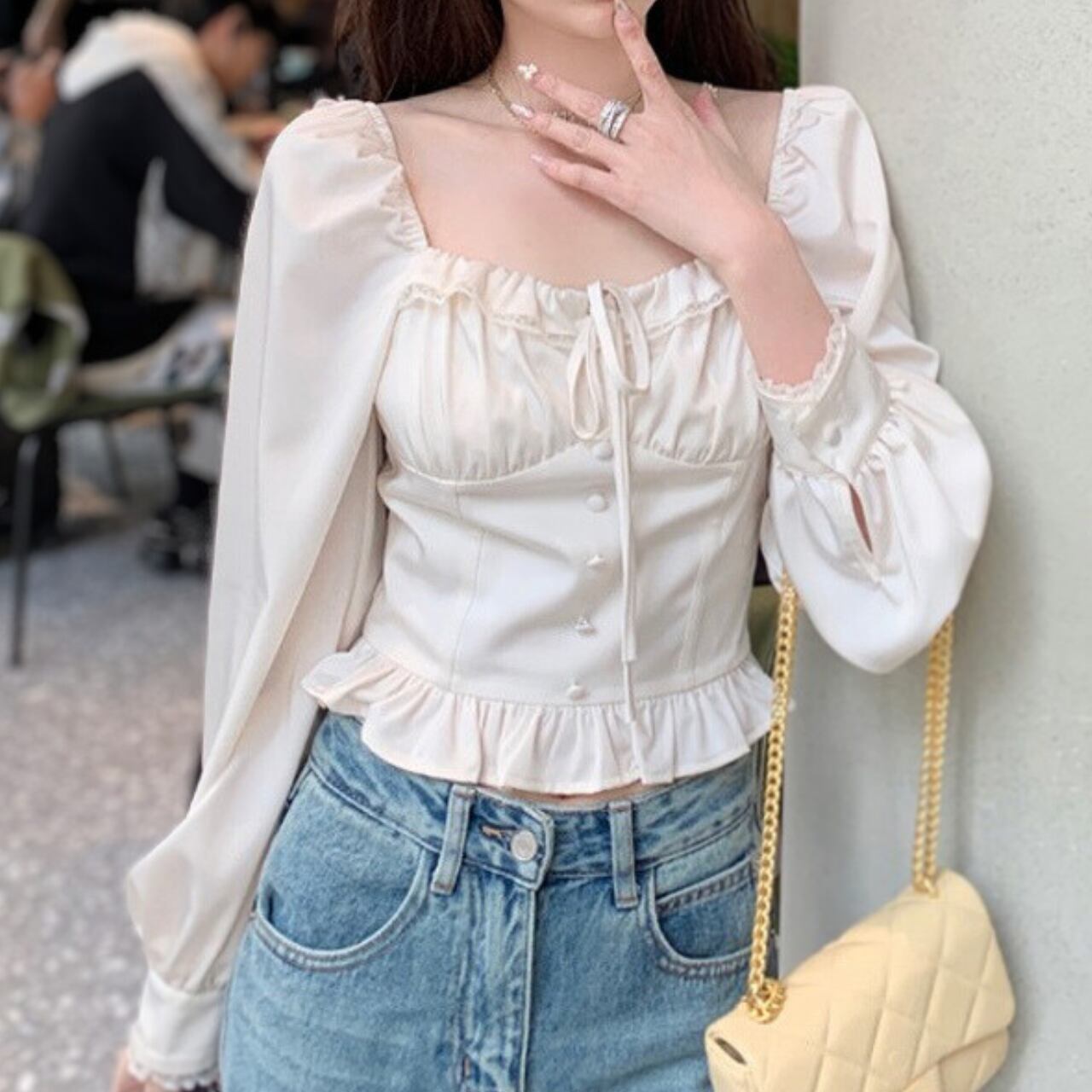 スクエアネックフリルトリムクロップド丈ブラウス A0326