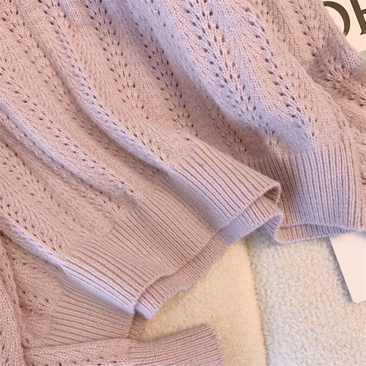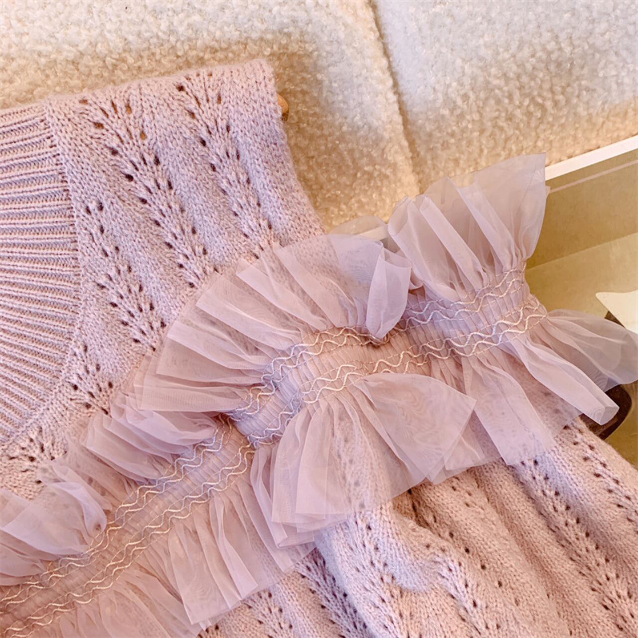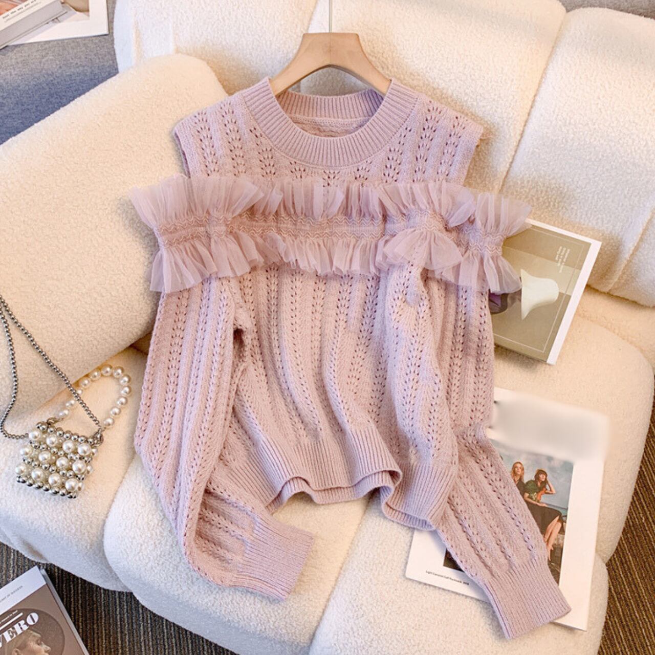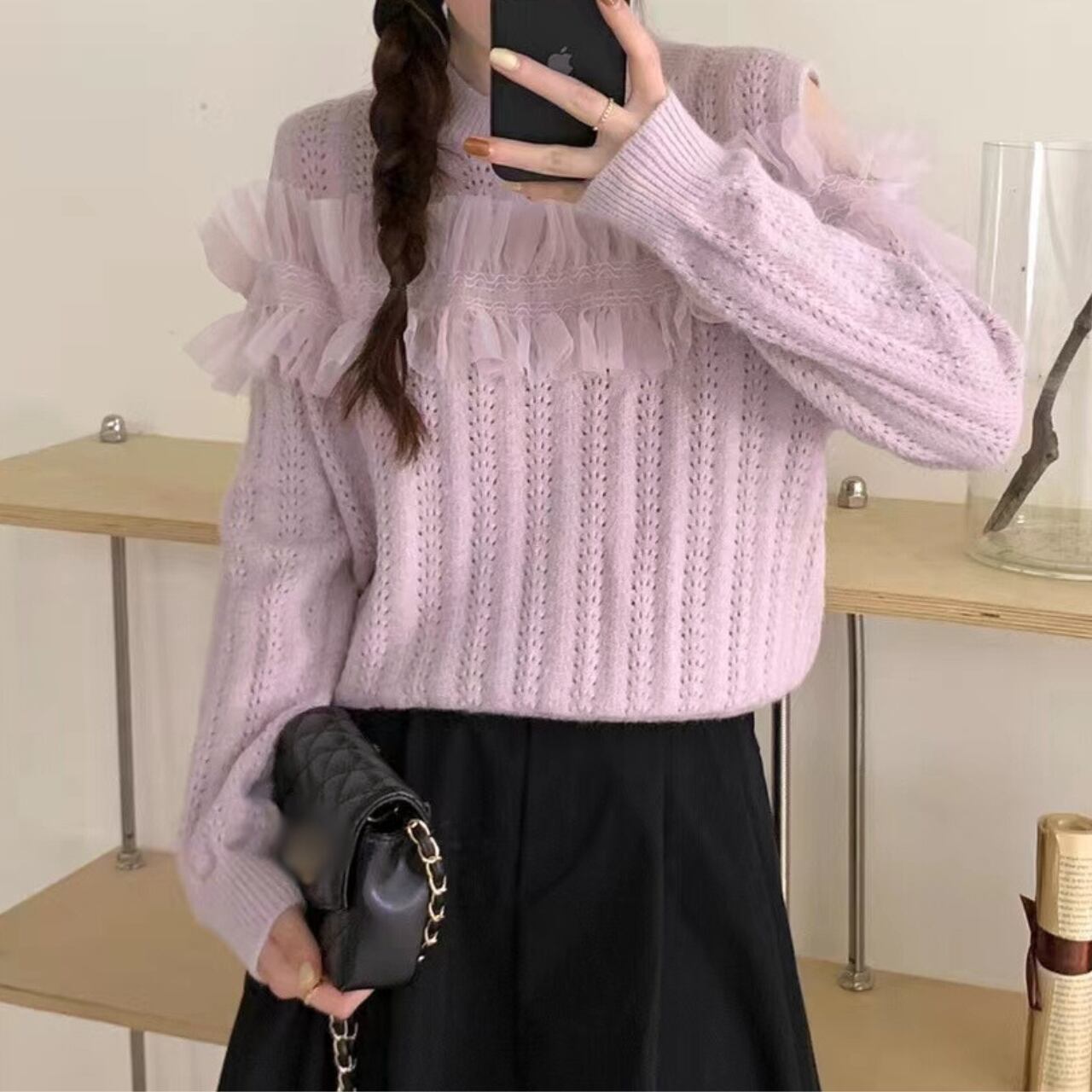 チュール袖フリルクルーネックニットプルオーバー A0323